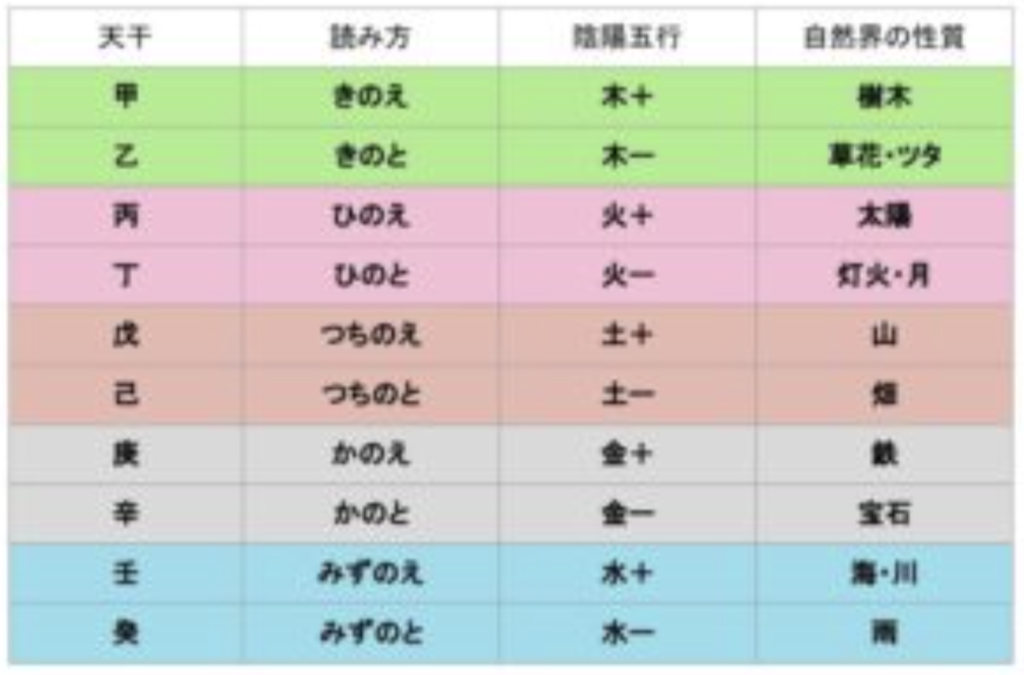 木火土金水の五行がそれぞれ陽(+)と陰(−)に分かれて、以下の様に10個に分かれます。