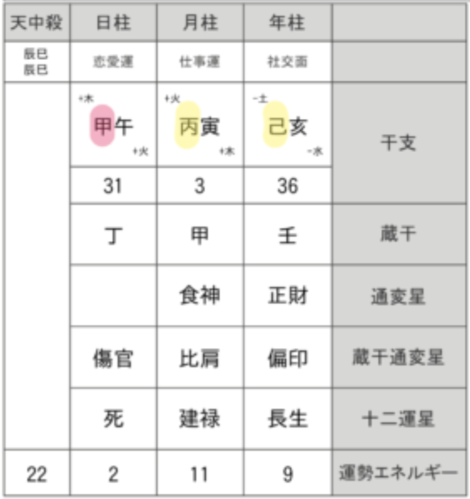 十干は、命式でいうとピンクと黄色でマーカーを引いた箇所になります。